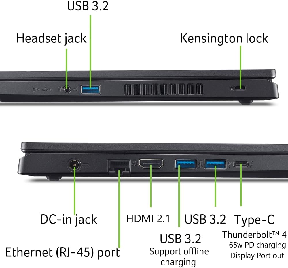 Thunderbolt 4: With the powerful Thunderbolt 4 port, you have the trifecta of power charging and data transfer with bidirectional movement and video display in one interface. | Stay Connected: Your gaming sanctuary is wherever you are. On the couch? Settle in with fast and stable Wi-Fi 6. Gaming Cafe? Get an edge online with Gigabit Ethernet. No matter your location, Nitro V 16 ensures you’re always in the driver’s seat.